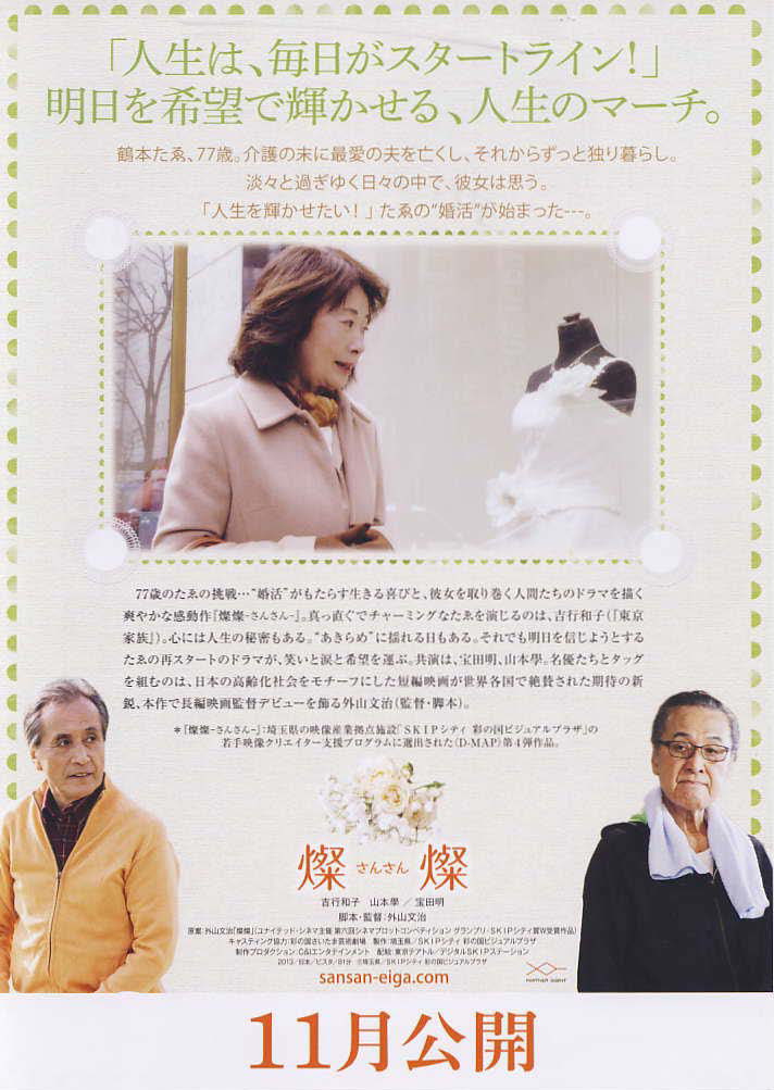 男性介護ネット3周年記念式典で、短編映画「此の岸のこと」の上映・トークでお招きした、外山文治監督の初の長編映画「燦燦(さんさん)」が全国公開されます。 ここ京都でも、いよいよ11月23日より京都シネマ(四条烏丸)にて上映されます。 そして上映に先立ち、外山監督の舞台挨拶が予定されています。 ご都合のよろしい方、ぜひ京都シネマまで足を運んでください。 ”「77歳婚活中」「人生は、毎日がスタートライン!」 明日を希望で輝かせる人生のマーチ” がキャッチコピーの映画、「燦燦(さんさん)」です。